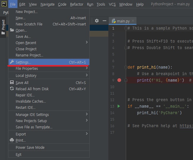 ① 메뉴에서 File → Settings을 클릭하거나 단축키 Ctrl+Alt+s를 클릭합니다.