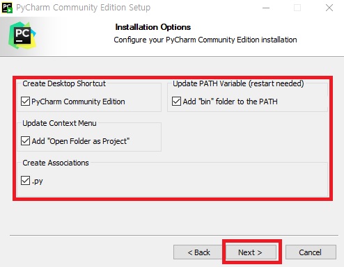 ⑤ 파이참(PyCharm) 설치 구성요소를 체크하는 과정입니다. 모두 체크(권장사항) 후 Next를 클릭합니다.